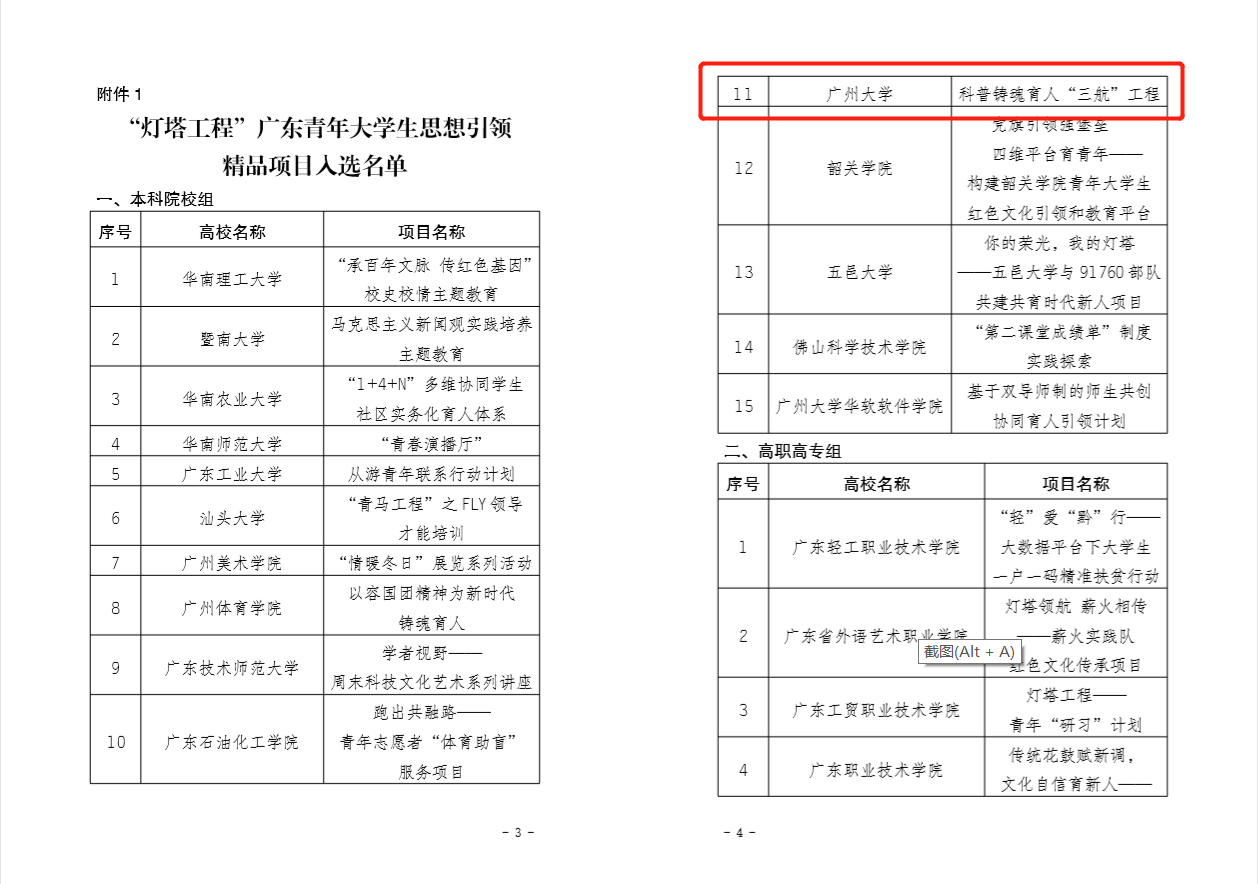 近日,团省委、省学联公布了“灯塔工程”广东青年大学生思想引领精品项目支持名单,我院申报的“科普育人传承初心使命·隔震助农守护美丽中国——科普铸魂育人‘三航’工程”精品项目”获得团省委立项,成为全省本科高校15个精品项目之一,是学校唯一获此成果的学院